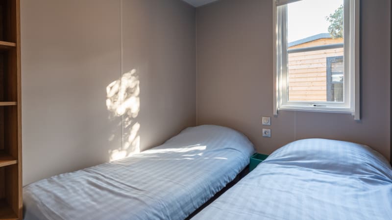 De mobil home is voorzien van drie slaapkamers, waarvan één met een tweepersoonsbed (160x200) en een badkamer ensuite. De tweede slaapkamer heeft twee éénpersoonsbedden (80x190) en de derde slaapkamer heeft een stapelbed. Alle bedden zijn voorzien van kussens en eenpersoons dekbedden. Het bijplaatsen van een babybedje is mogelijk.