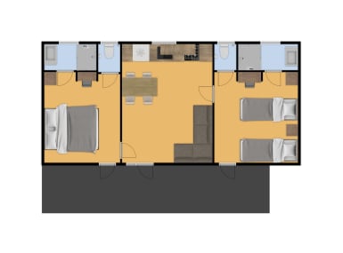 De royale chalets op Val de Cantobre zijn te huur voor gezelschappen tot vijf personen. De ruime keuken heeft een groot werkblad, 4-pits gasfornuis, vaatwasser en koel/vriescombinatie. In de badkamer bevindt zich een ruime douche en er is een aparte toiletruimte.