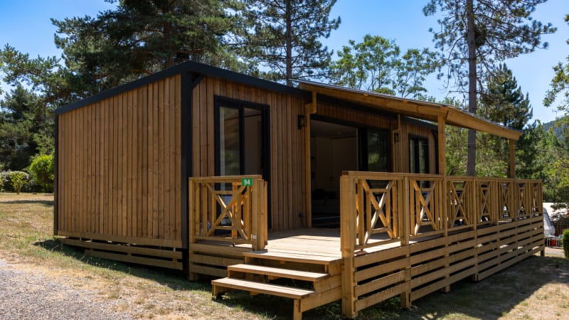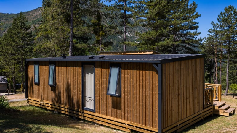 De mobil home heeft een groot overdekt terras met meubilair en een prachtig uitzicht over de bergen en de natuur. De auto kan naast de accommodatie geparkeerd worden.