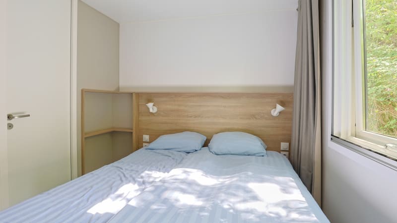 De mobil home is voorzien van twee slaapkamers, waarvan een met een tweepersoonsboxspringbed en eigen badkamer. De andere slaapkamer beschikt over twee losse eenpersoonsbedden. Alle bedden zijn voorzien van kussens en eenpersoons dekbedden. Het bijplaatsen van een babybedje is mogelijk.