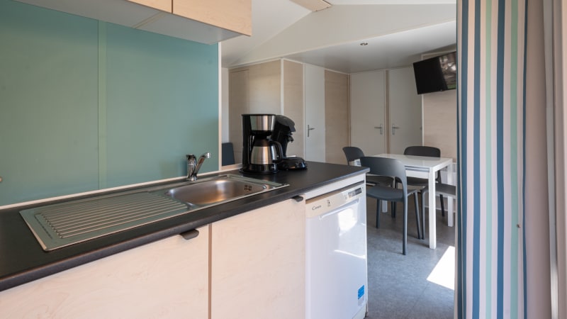 De ruime woonkeuken heeft een koelkast met vriesvak, vaatwasser, een gewone magnetron, een fluitketel, een broodrooster, Senseo koffiezetapparaat en een 4-pits gaskookplaat. Er is een gezellige zit- en eethoek voor zes personen. De keuken is aan de voorkant van de mobil- home geplaatst waardoor je via de openslaande deuren zo je veranda oploopt.