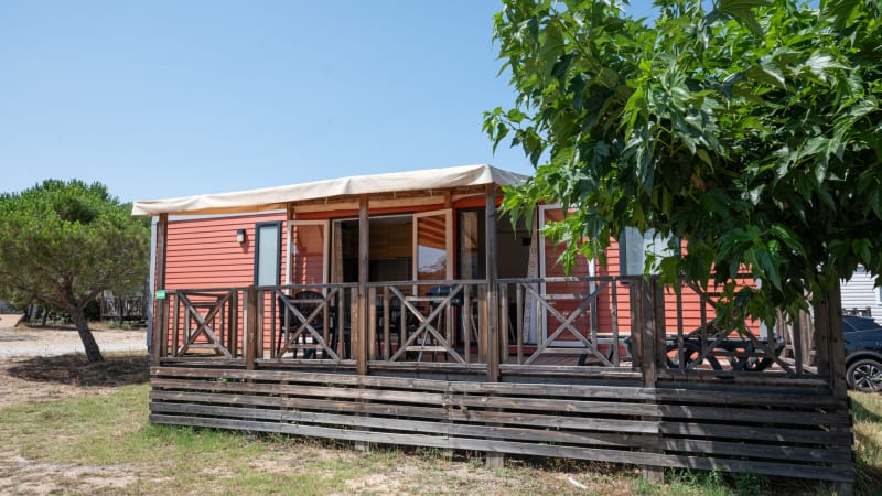 De ruime mobil home Esterel is van alle luxe voorzien. Deze mobil homes zijn deels gelegen tussen de particuliere accommodaties en beschikken over een eigen tuin. Verder beschikt deze extra ruime mobil home over: airco, BBQ, twee badkamers en apart toilet.