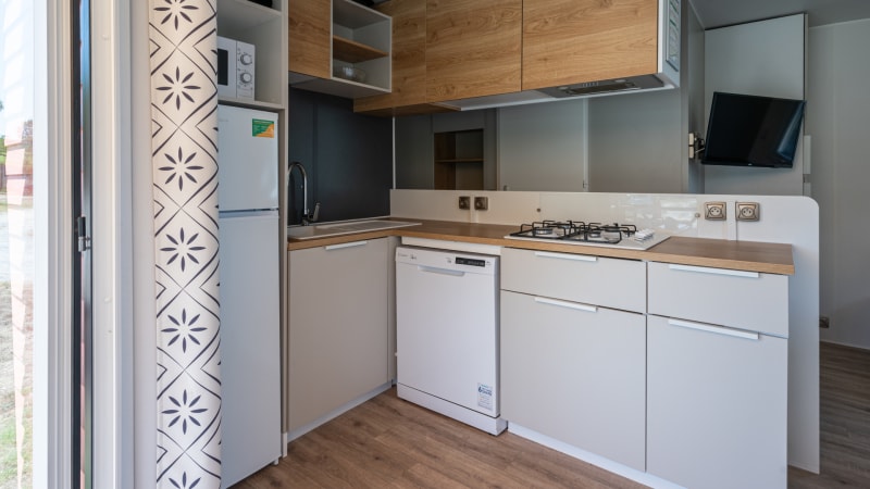 De mobil home heeft een L-vormige bank en een eettafel voor zes personen in het woongedeelte. De openslaande deuren naar het terras geven een ruimtelijk gevoel.