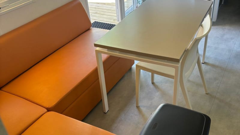 In het woongedeelte is het aangenaam vertoeven op de lekkere hoekbank of aan de eettafel met deze hoekbank en twee losse stoelen. Vanuit het woongedeelte heb je toegang tot het half overdekte terras.