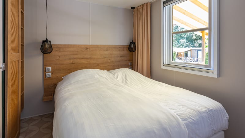 Slaapkamer De mobil home heeft drie slaapkamers waarvan één met een tweepersoonsbed (160 x 200) en de andere twee slaapkamers hebben twee éénpersoonsbedden (80 x 200). Alle bedden zijn voorzien van kussens en eenpersoons dekbedden.