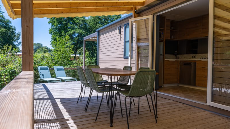Buiten Deze mobil home heeft een extra grote veranda met uitzicht op het water. Het zitje aan het water heeft wat schaduw. Een gedeeltje van de veranda is overdekt en er is een tuintafel met stoelen en ligbedden aanwezig.
