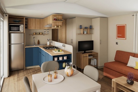 Het model Violette is ideaal als je comfortabel met de hele familie of een grotere groep wilt verblijven op je jaarplaats. Dit ruime chalet is geschikt voor zes personen en biedt dankzij de praktische indeling alle privacy en ruimte die je nodig hebt.