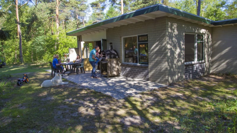 Buiten Vanaf het overdekte terras op het zuiden, met comfortabel tuinmeubilair en een houtgestookte pizza oven (die je ook als BBQ kunt gebruiken) kun je genieten van al het groen en de bosdieren om je heen. Ook heb je beschikking over 2 ligbedden om buiten te relaxen. De auto kun je bij de bungalow parkeren.