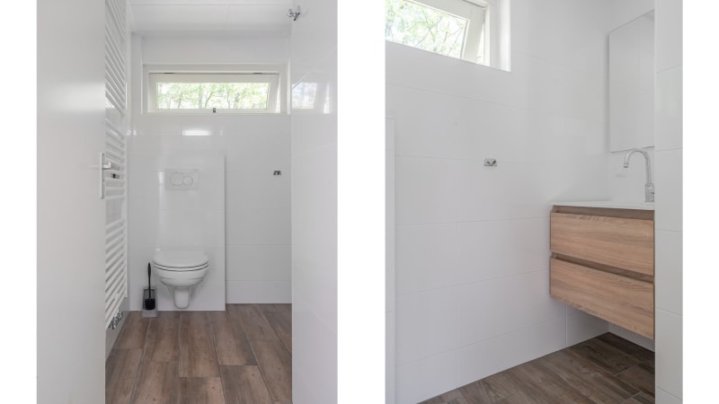Badkamer De badkamer is voorzien van een inloopdouche, wastafel en toilet en er is een (tweede) gescheiden toiletruimte.