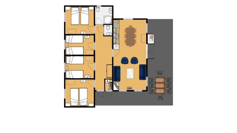 Slaapkamer Er zijn vier slaapkamers met elk een eigen wastafel en twee eenpersoons boxspringbedden van 0,80 bij 2 meter. Er liggen bij aankomst eenpersoonsdekbedden en kussens klaar.