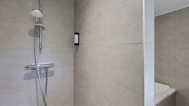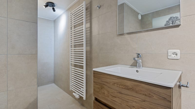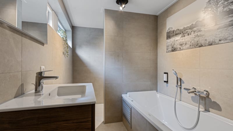 Badkamer De bungalow is recent voorzien van een aanbouw inclusief gloednieuwe badkamer met ruime wastafel, grote spiegel en voor echte luxe een heerlijk ligbad (180 cm) met bubbelbadfunctie! De bungalow is tevens voorzien van een apart toilet.