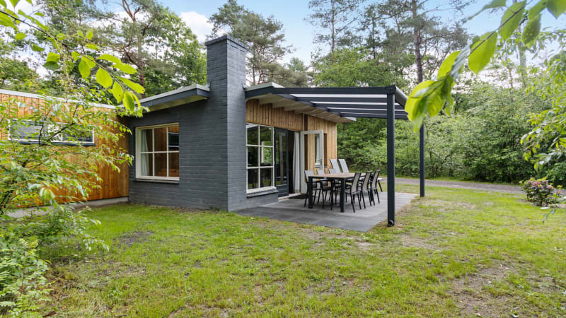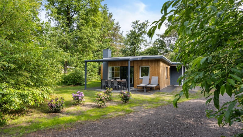 Buiten Het terras met overkapping en de tuin op het zuiden zijn ruim en bieden veel privacy. Vanaf het terras, met comfortabel tuinmeubilair, kun je genieten van al het groen en de bosdieren om je heen. De auto kun je bij de bungalow parkeren.