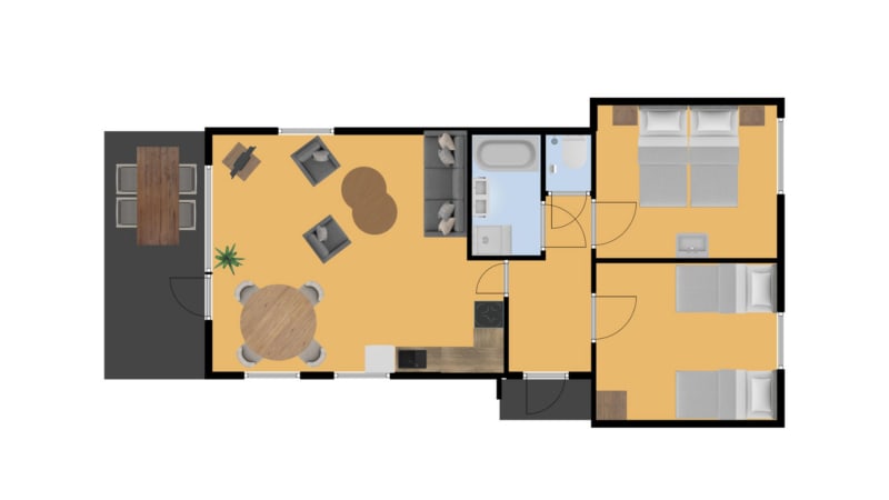 Keuken De bungalow heeft een open keuken met een 4-pits inductie kookplaat, vaatwasser, koelkast, combimagnetron, waterkoker, filter koffiezetapparaat en Nespresso apparaat. De eethoek is geschikt voor vier personen.