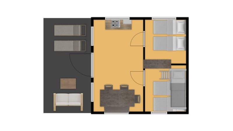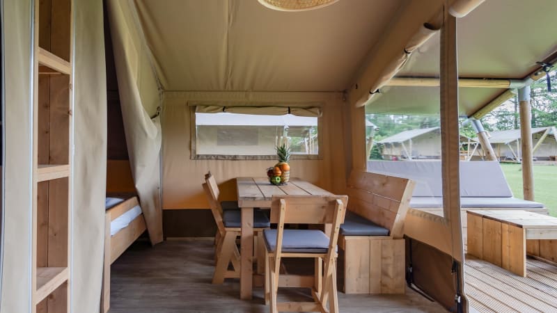In de safaritent bevinden zich twee slaapruimtes. Eén met een tweepersoonsbed en één met een stapelbed en extra eenpersoonsbed..