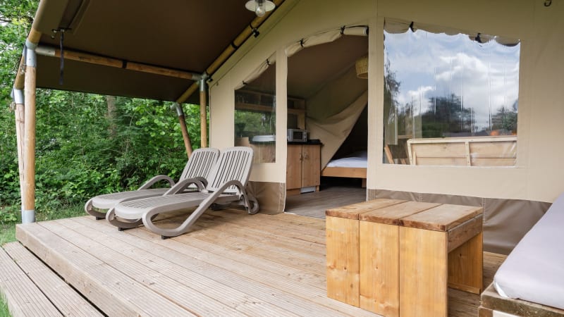 Buiten Vanaf het terras met comfortabel tuinmeubilair kun je genieten van al het groen en fauna om je heen. De safaritent staat op een stevige houten vlonder met schaduwdoek. Je zit altijd hoog en droog.