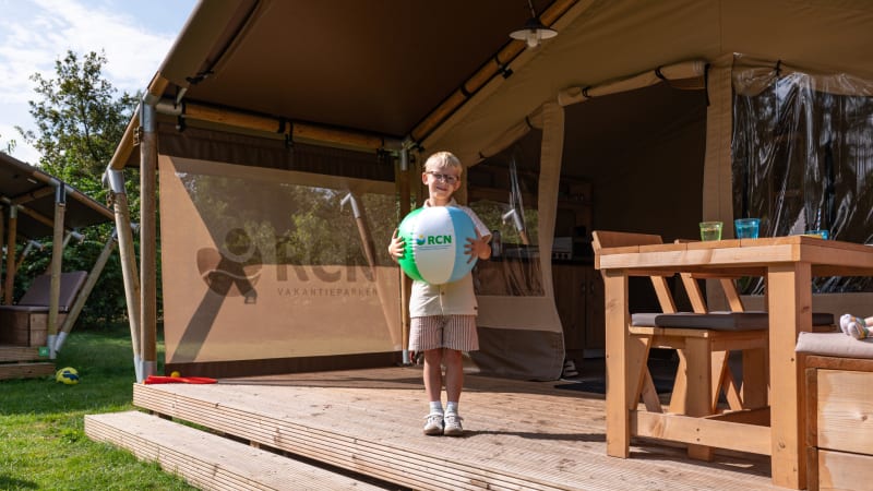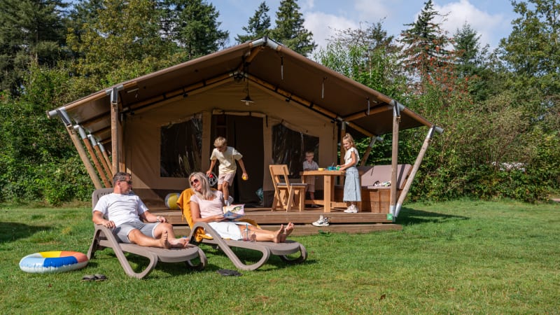 Slapen in een safaritent? Dat is de droom van elk kind! In deze safaritent kruipen de jongsten knus onder de wol in hun eigen slaapvertrek met stapelbed. Geschikt voor 5 personen. Door de twee grote openslaande tentdoeken aan de voorkant ontstaat er een ruimtelijk gevoel.
