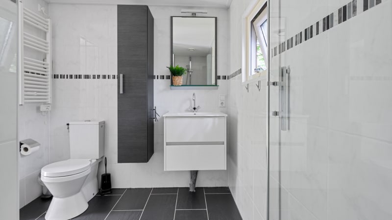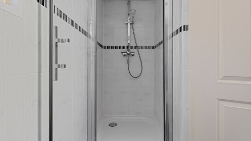 Badkamer De ruime badkamer is uitgerust met een wastafel, douche en toilet.
