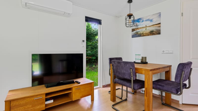 Woonkamer De gezellige woonkamer is voorzien van een eethoek voor drie personen en een airco, zodat je ook op warme dagen comfortabel verblijft.