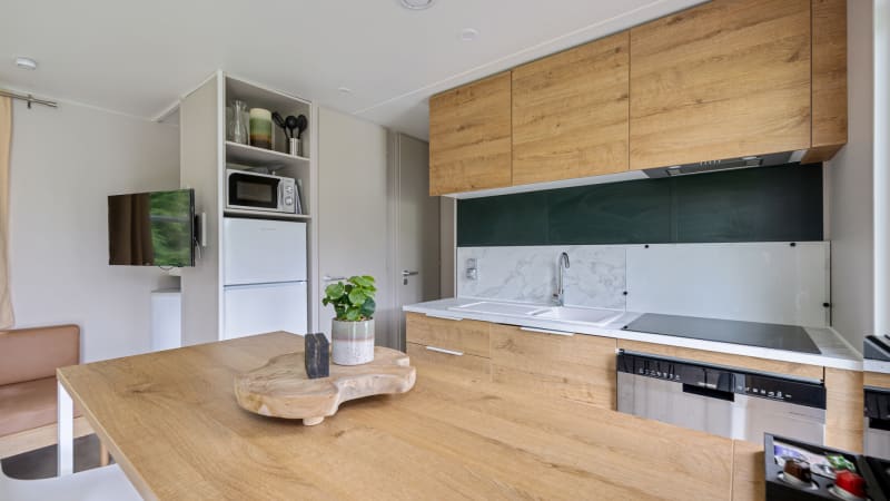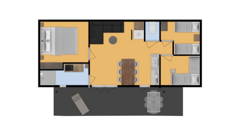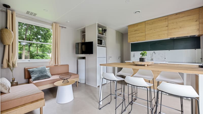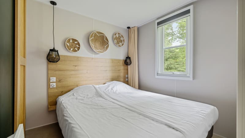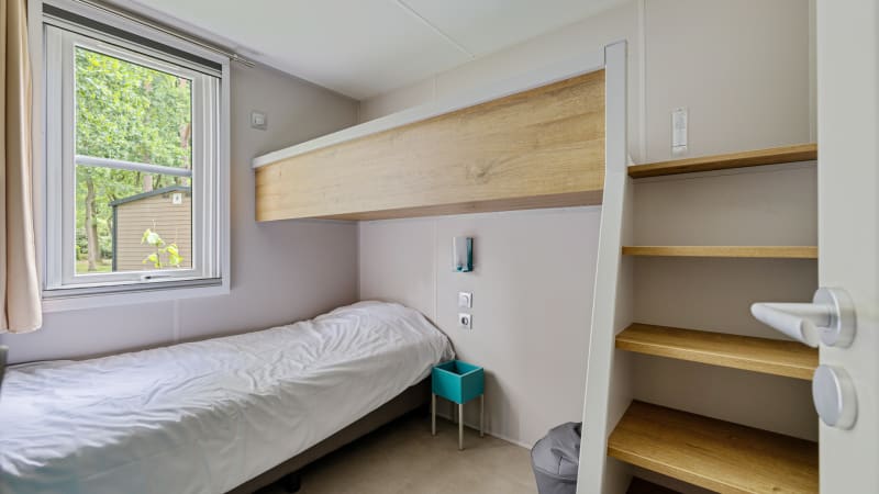 Slaapkamer De Mobil Home heeft drie slaapkamers. De eerste heeft twee eenpersoonsbedden, de tweede een hoogslaper met een extra eenpersoonsbed (ideaal voor kinderen) en de derde slaapkamer heeft een tweepersoonsbed.