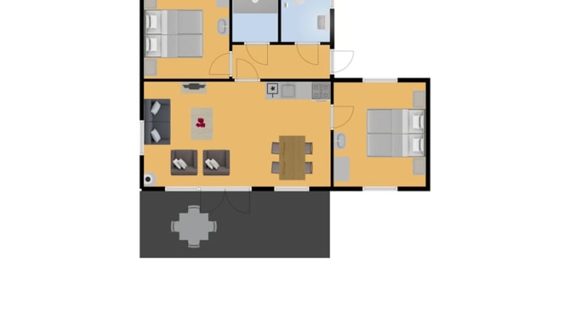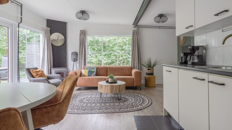 De bungalow heeft een moderne keuken met een 4-pits gaskookplaat, koelkast met vriesvak, filter koffiezetapparaat én espressomachine, vaatwasser en een combimagnetron. De eethoek is geschikt voor vier personen.