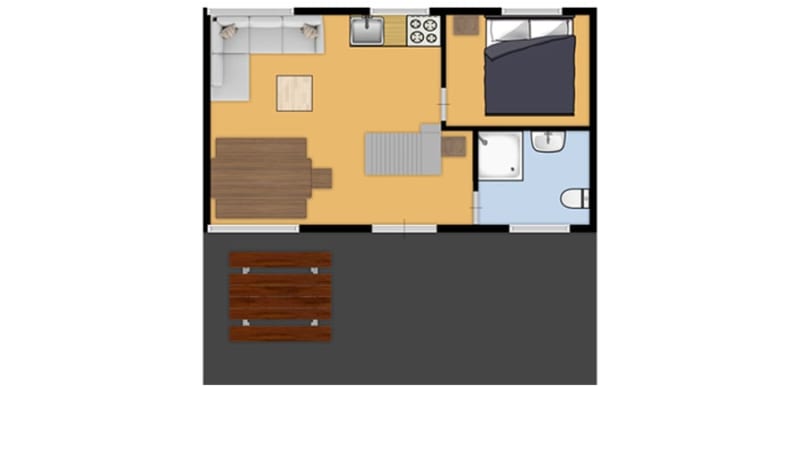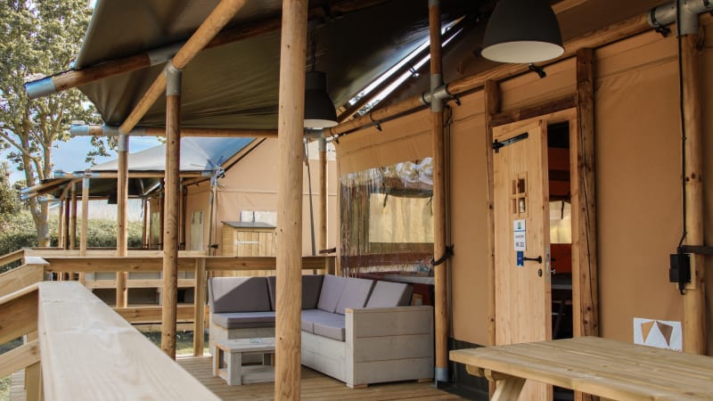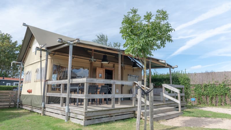 De ruime veranda (op verhoging, deels overdekt!) geeft een heerlijk beachgevoel. De picknicktafel en een aparte loungeset staan er tot je beschikking.